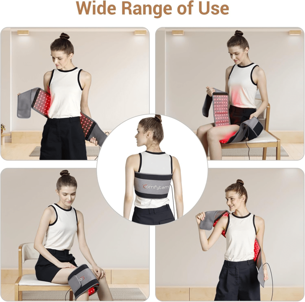 These flexible LED wraps can be secured around areas like the lower back, thighs, abdomen, or neck.